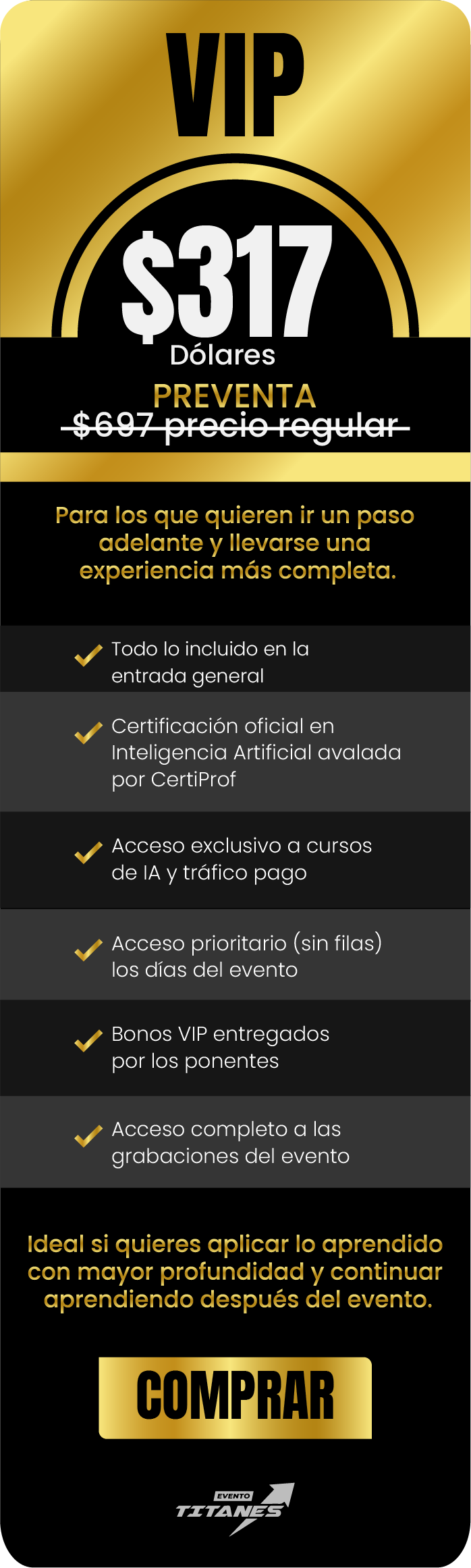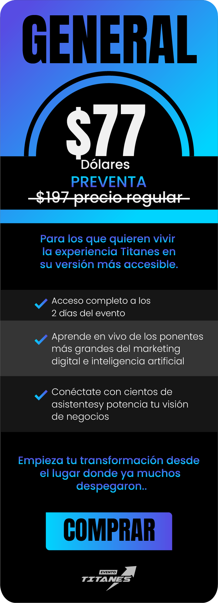 El Evento Titanes 2025 es el punto de encuentro obligado para los negocios digitales: aprender estrategias de quienes ya están facturando millones, descubrir herramientas de IA y marketing que transforman resultados, conectar con referentes globales, crear alianzas de alto valor y vivir una experiencia única que eleva tu visión de emprendedor y empresario al siguiente nivel.