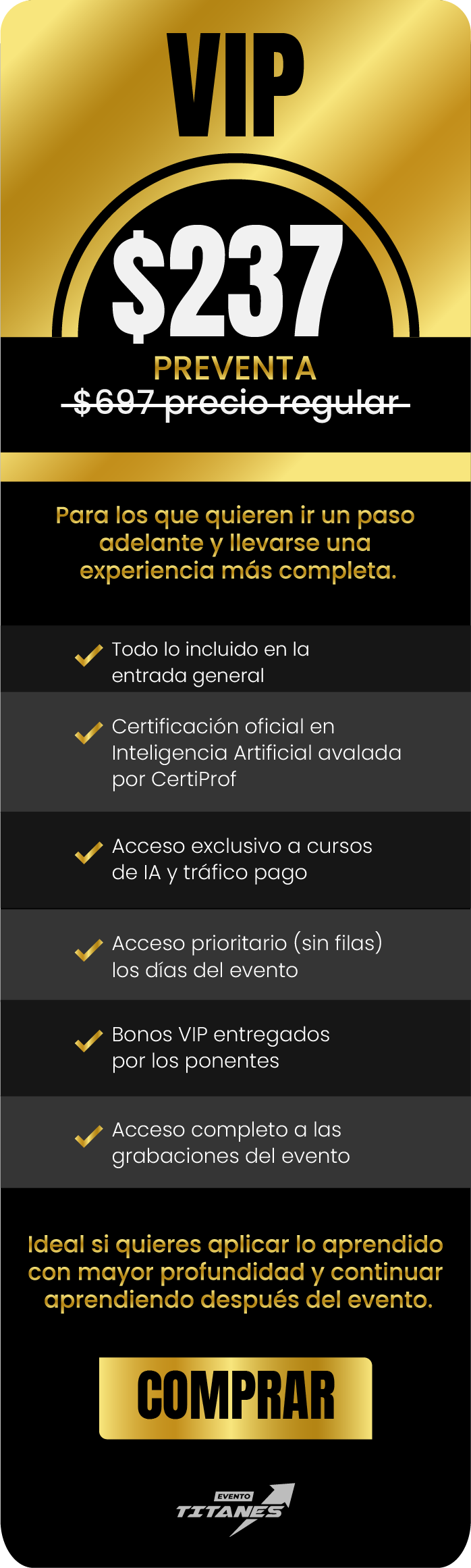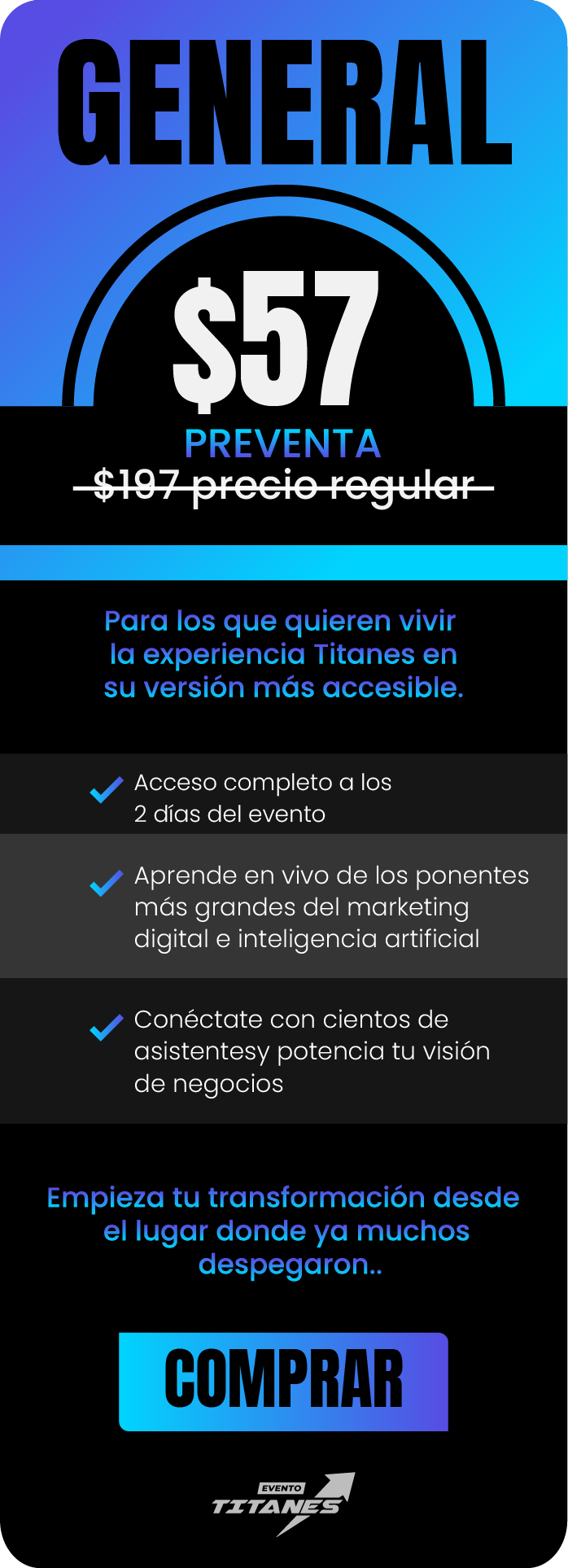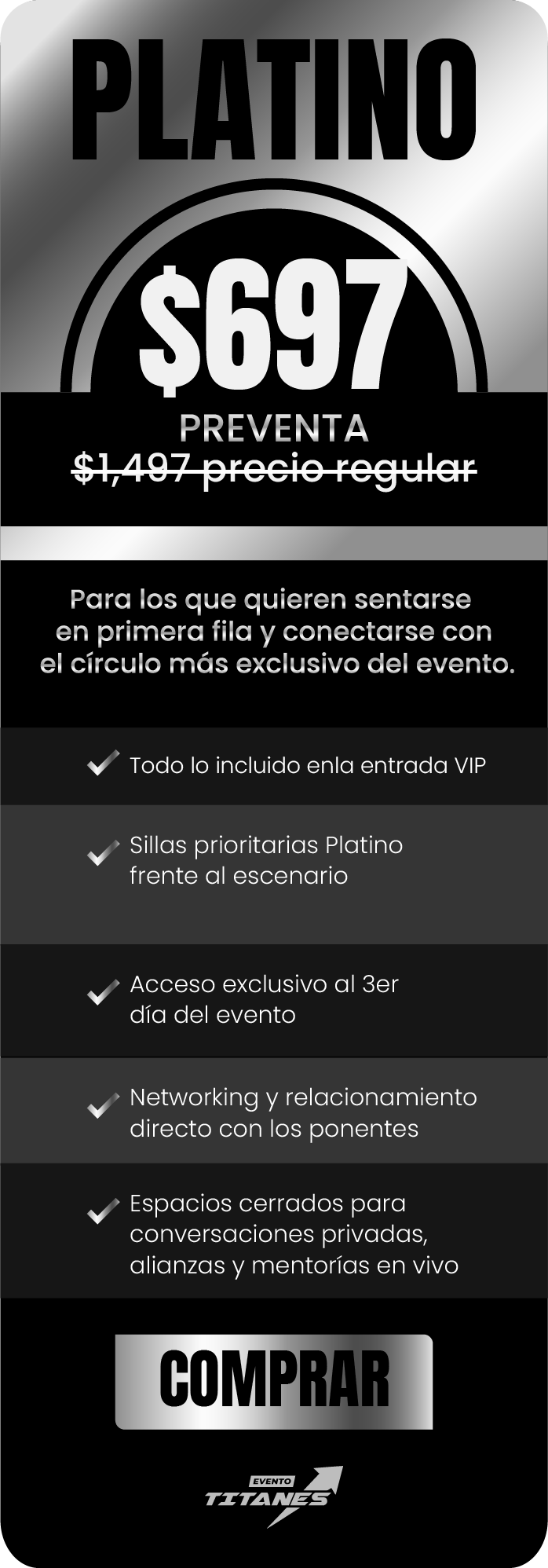 El Evento Titanes 2025 es el punto de encuentro obligado para los negocios digitales: aprender estrategias de quienes ya están facturando millones, descubrir herramientas de IA y marketing que transforman resultados, conectar con referentes globales, crear alianzas de alto valor y vivir una experiencia única que eleva tu visión de emprendedor y empresario al siguiente nivel.